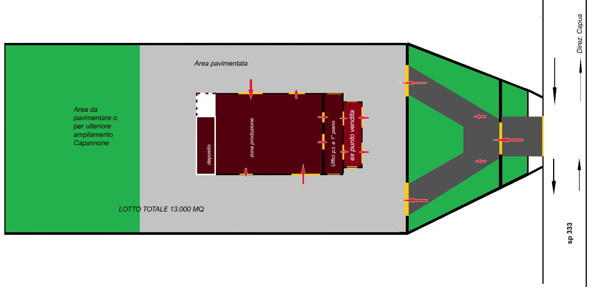 - **Ampio fronte su SP 333:** Con un'ottima esposizione, il capannone è perfetto per qualsiasi tipo di attività commerciale o logistica.