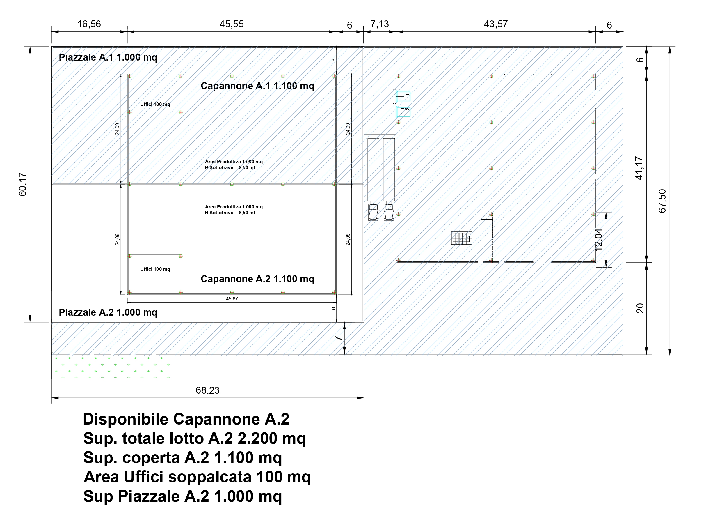 Oppure Due Capannoni da 1100 mq oltre uffici da 100 mq con piazzale esclusivo di 1000 mq. Altezza del Capannone è di 8,50 mt sottotrave.
